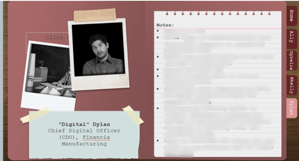 As I thought it would be almost impossible for a learner to get through the conversations on their own, I created a folder for each persona (which I’ve blurred here for privacy) that learners could access throughout the course. This was also a fun way for me to hide little Easter eggs about each persona!
